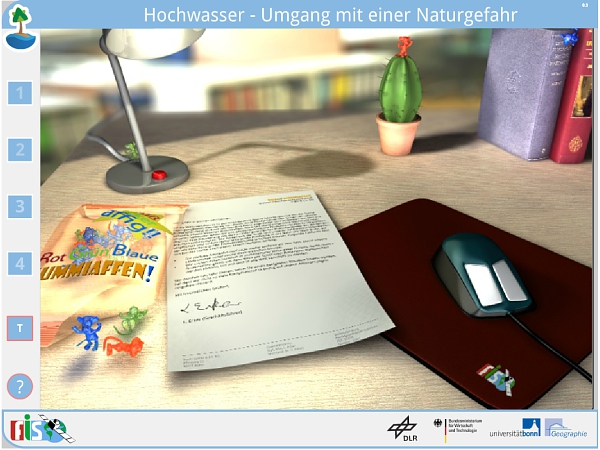 Der erste Bereich des Moduls wird nach dem Start automatisch geladen. Zu Beginn ist ein Schreibtisch zu sehen, auf dem unter anderem ein Brief mit Hintergrundinformationen für die Schülerinnen und Schüler liegt (siehe Abbildung 1). Erst nachdem die Lernenden den Brief geöffnet haben, können sie mit einem Klick auf die Computermaus auf dem Schreibtisch ins nächste Kapitel springen.